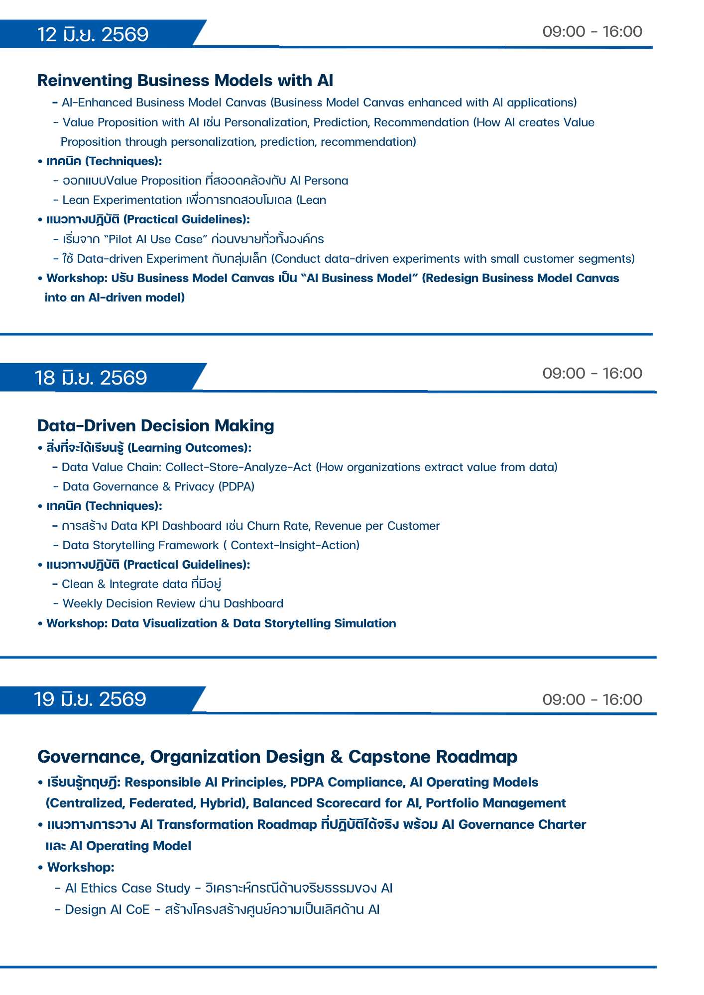 3. เพื่อออกแบบ Roadmap ที่เป็นรูปธรรม ผู้เรียนไม่เพียงแต่เรียนรู้ทฤษฎี แต่ได้ลงมือทำ Project จริงในองค์กรของตนเอง และจบด้วยการนำเสนอแผน AI Transformation