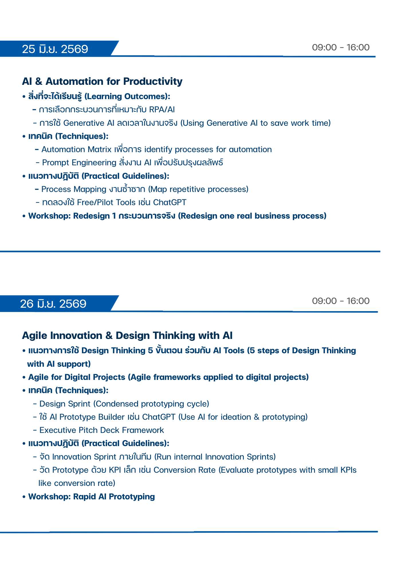 2. เพื่อเพิ่ม Skillset ที่ใช้งานจริง ผู้เรียนได้ฝึกใช้ Frameworks, Tools และเทคนิค เช่น Business Model Innovation, Data Storytelling, AI Prototyping ที่นำกลับไปใช้ได้ทันที