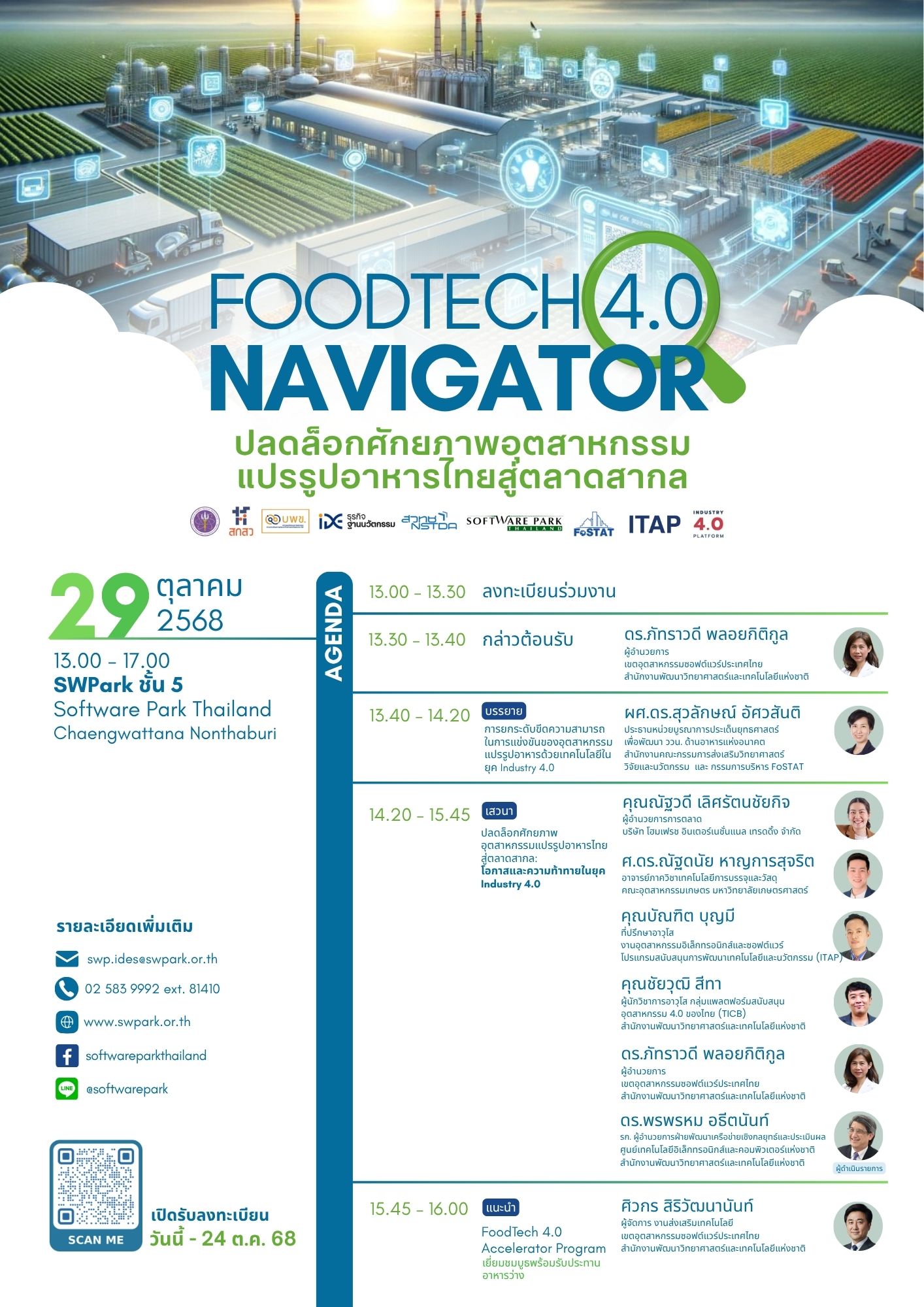 | 21 พ.ย 68 | การประยุกต์ใช้เทคโนโลยีสมัยใหม่สู่อุตสาหกรรม 4.0 | ความรู้เบื้องต้นและกรณีศึกษาด้าน IoT, Big Data Analytics, Cloud Computing, Robotics AI และ Cybersecurity & PDPA ในภาคอุตสาหกรรมอาหาร |